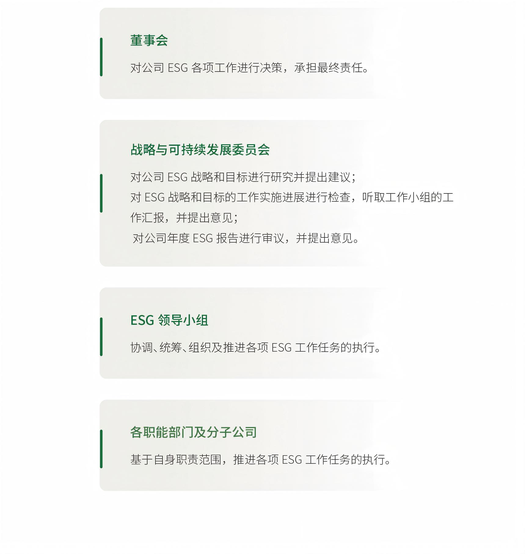 乐鱼网站高度重视ESG管理,构建了完善的ESG管理架构,并制定配套的管理制度。公司董事会是ESG管理的最终责任主体,下设董事会战略与可持续发展委员会,负责统筹ESG相关工作。公司已发布《leyu.乐鱼董事会战略与可持续发展委员会工作细则》,明确委员会的人员组成、职责权限及议事规则,为ESG治理提供制度保障。