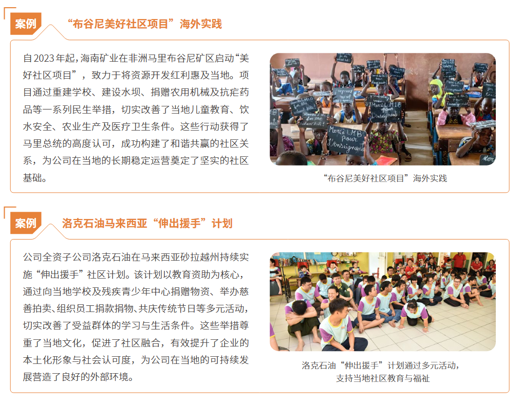 在海外业务布局中,公司积极履行属地社会责任,全面推进属地化公益项目建设。在非洲马里深入实施 “布谷尼美好社区” 项目,开展乡村学校援建、安全饮水工程、农业设备支持、儿童抗疟药品捐赠、医疗健康救助等民生行动;全资子公司洛克石油在马来西亚持续开展 “伸出援手” 计划,重点实施教育资助、教学物资捐赠、弱势群体关爱等社区帮扶,推动海外社区和谐共融、共享发展成果。