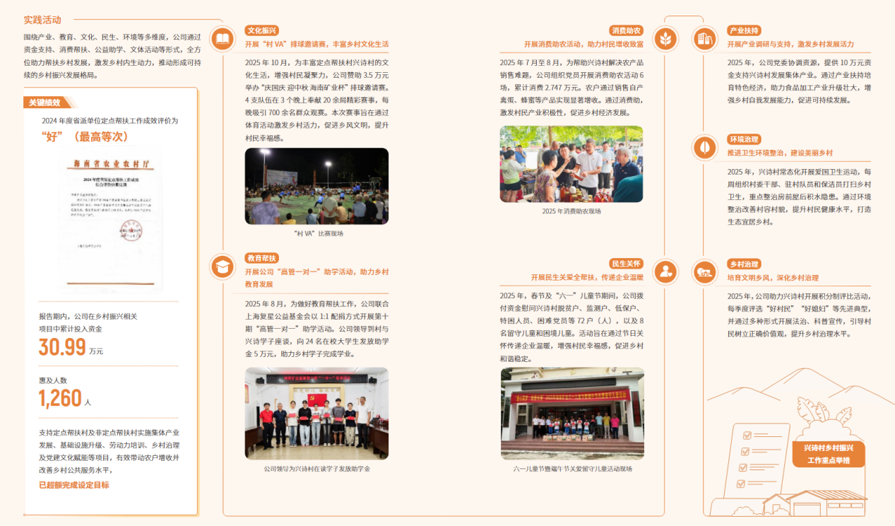公司持续深耕定点帮扶工作,建立长效帮扶机制,专项投入资金支持帮扶村特色产业培育、人居环境整治提升、基础设施完善与民生关爱服务。常态化开展助学助困、消费助农、文化振兴、困难群众慰问等多元帮扶行动,扎实推动巩固拓展脱贫攻坚成果同乡村振兴有效衔接,省派定点帮扶工作获评最高等次 “好”,以责任担当助力乡村全面振兴。