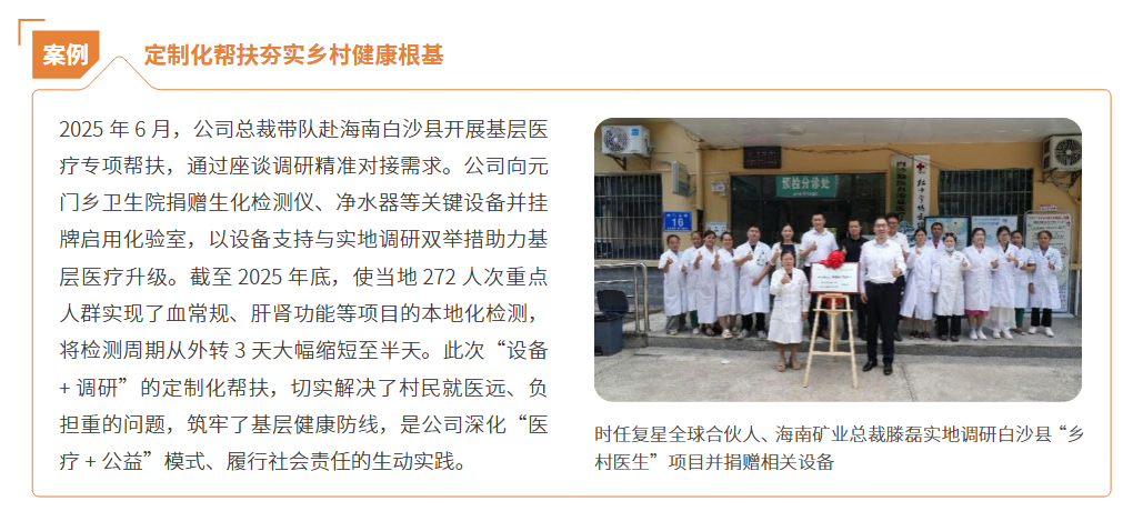 公司持续深耕乡村医生扶持项目,长期为基层村医提供能力提升培训、外出进修深造、医疗设备捐赠等精准支持,不断改善基层诊疗条件、提升乡村医疗服务水平。积极参与地方各类健康公益行动,聚焦基层医疗短板精准发力,切实提升群众就医获得感与健康保障水平,以实际行动守护基层群众生命健康,助力健康中国建设。